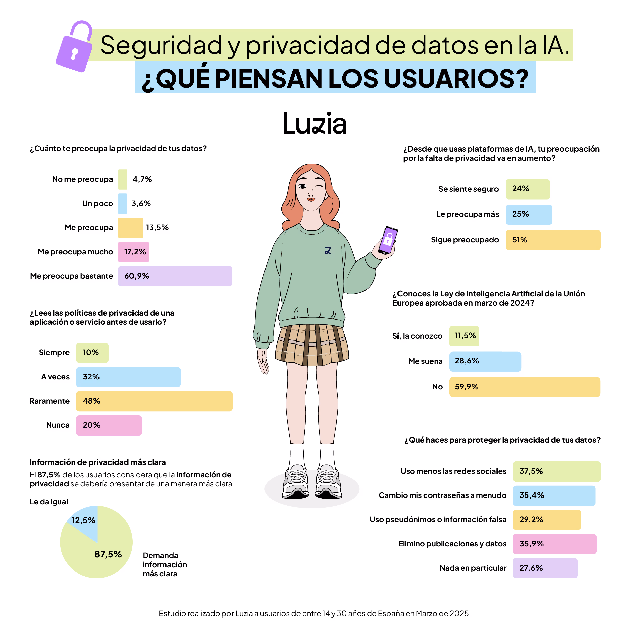 La encuesta de Luzia constata una falta de comprensión o interés en torno a las políticas de privacidad: sólo un tercio de los encuestados lee ‘a veces’ las políticas de privacidad de una nueva aplicación o servicio antes de usarlo, mientras que cerca de la mitad casi nunca o nunca las lee. El 87,5% de los usuarios considera que la información de privacidad debería presentarse de una manera más clara, directa y precisa.